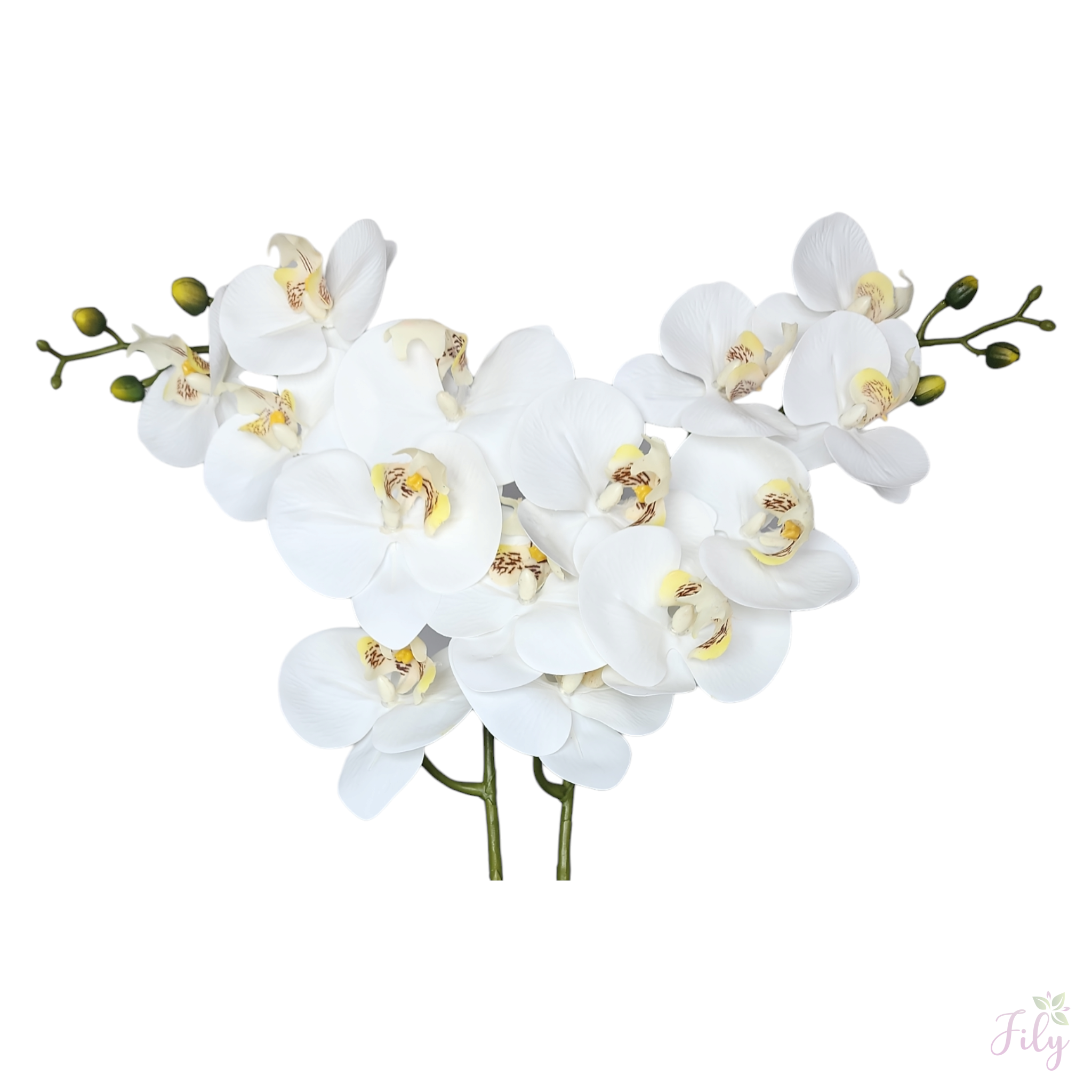 – Detalhes Naturais: Orquídeas cuidadosamente moldadas para imitar a aparência e a textura das flores naturais, proporcionando um visual autêntico.