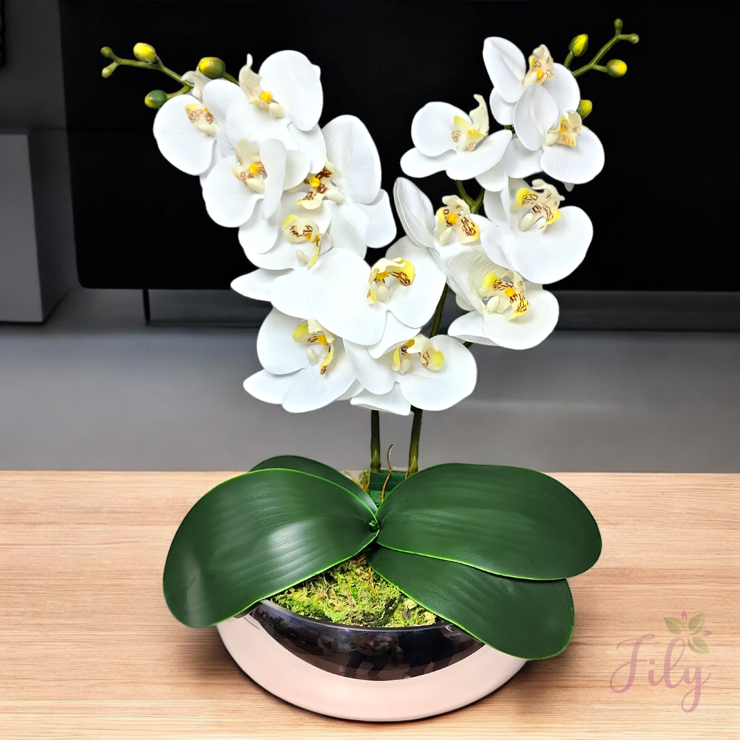 Escolha nosso arranjo de orquídeas artificiais para adicionar um toque de elegância e exotismo aos seus espaços, criando ambientes florais encantadores sem a necessidade de manutenção constante. Ideal para quem busca praticidade e beleza duradoura na decoração.