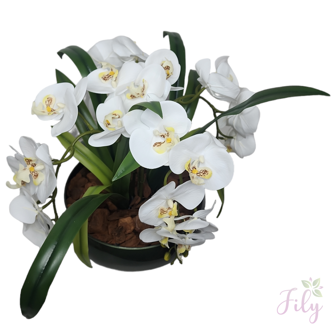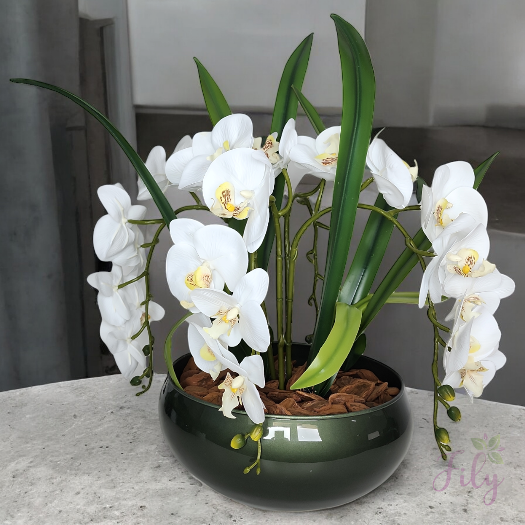 – Detalhes Naturais: Orquídeas cuidadosamente moldadas para imitar a aparência e a textura das flores naturais, proporcionando um visual autêntico.