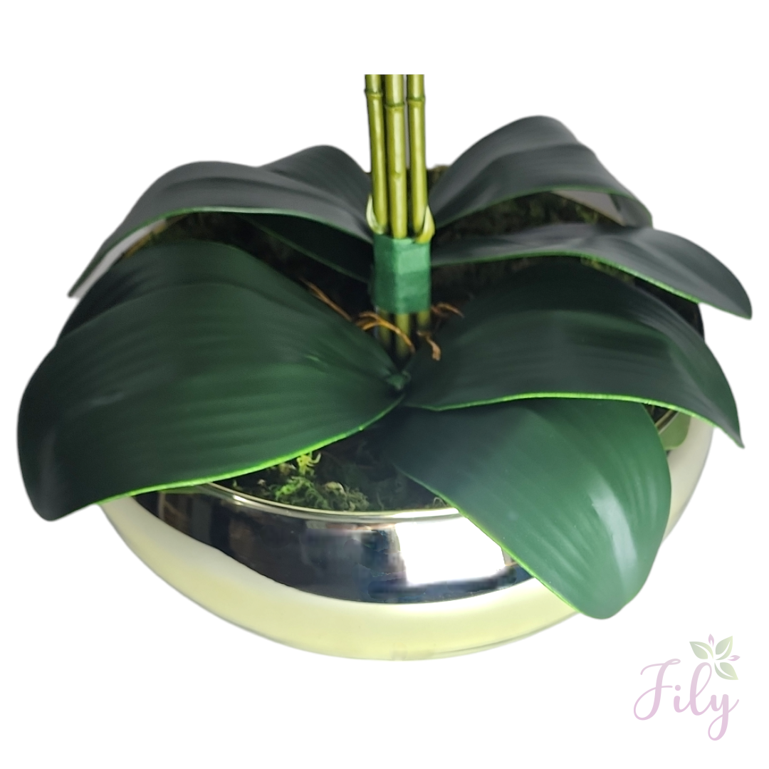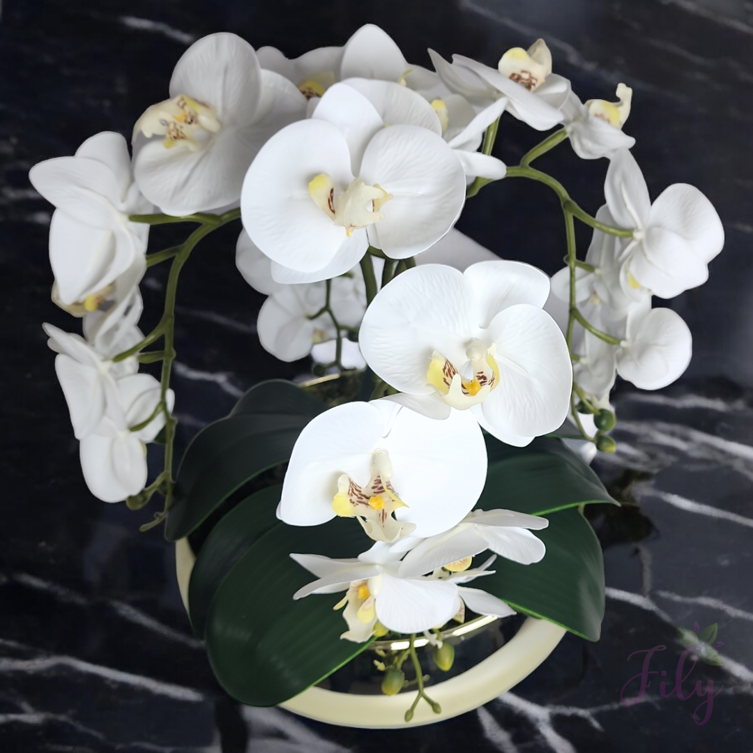 – Detalhes Naturais: Orquídeas cuidadosamente moldadas para imitar a aparência e a textura das flores naturais, proporcionando um visual autêntico.