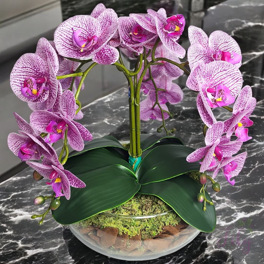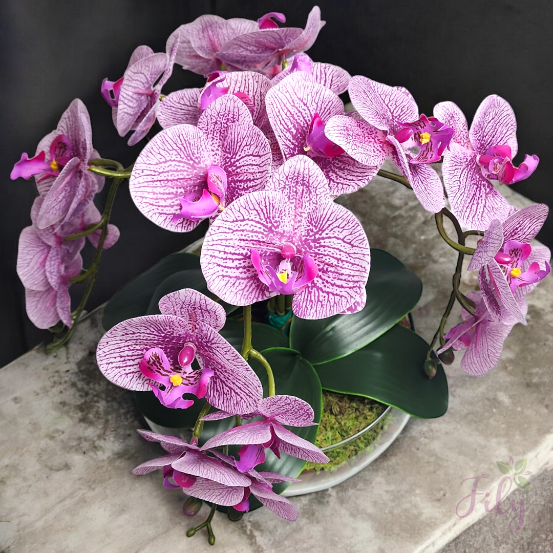 – Detalhes Naturais: Orquídeas cuidadosamente moldadas para imitar a aparência e a textura das flores naturais, proporcionando um visual autêntico.