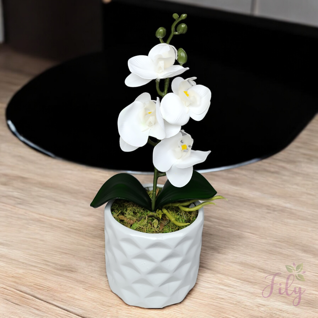 Arranjo de Mini Orquidea Branca Vaso cerâmica Diamante Branco