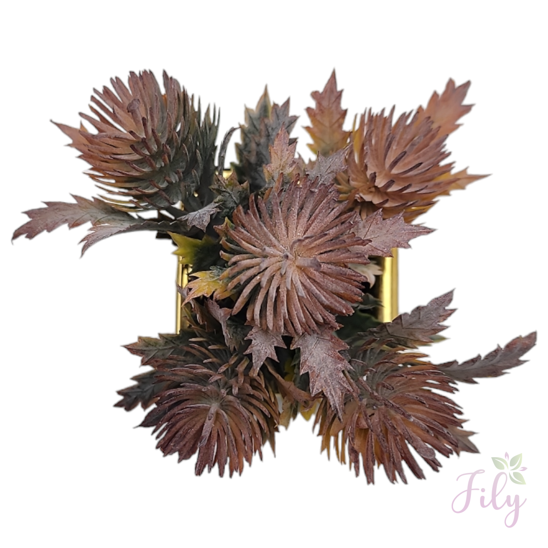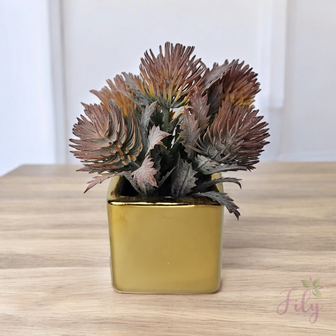 Vaso cerâmica dourado quadrado com verdinho Dipsacus marrom