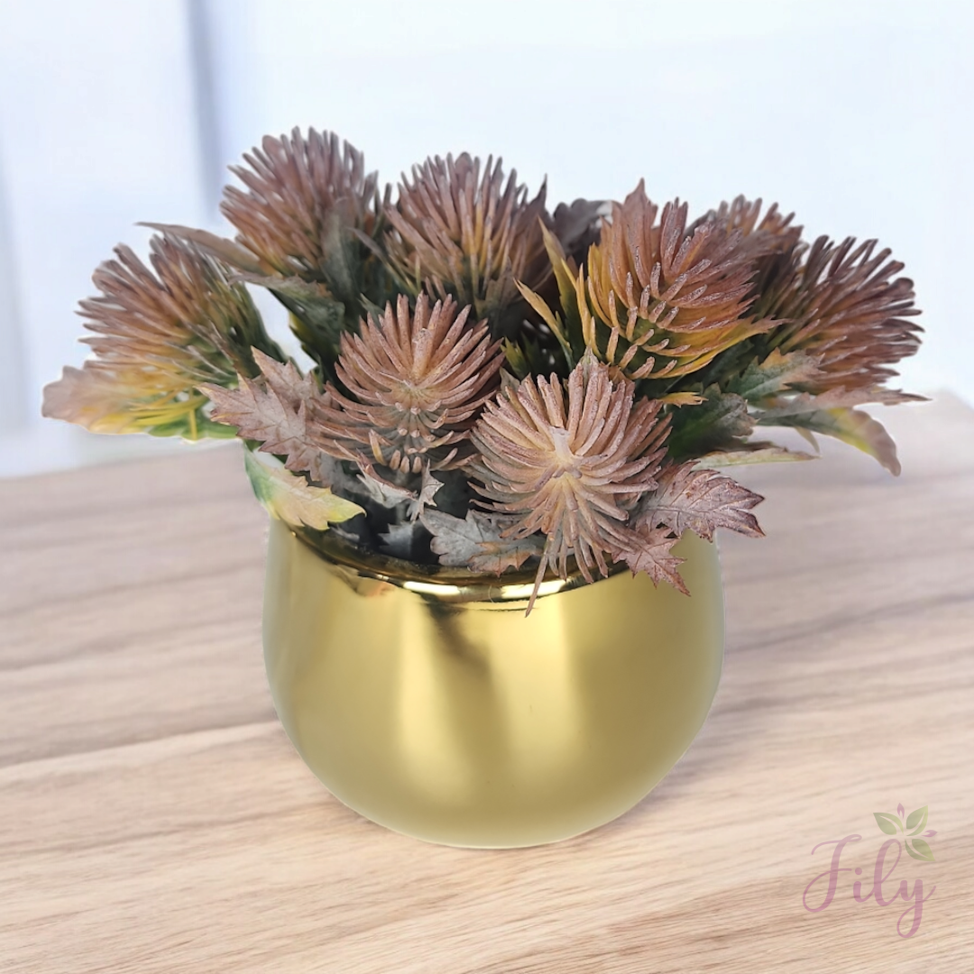Vaso cerâmica dourado redondo com verdinho Dipsacus marrom